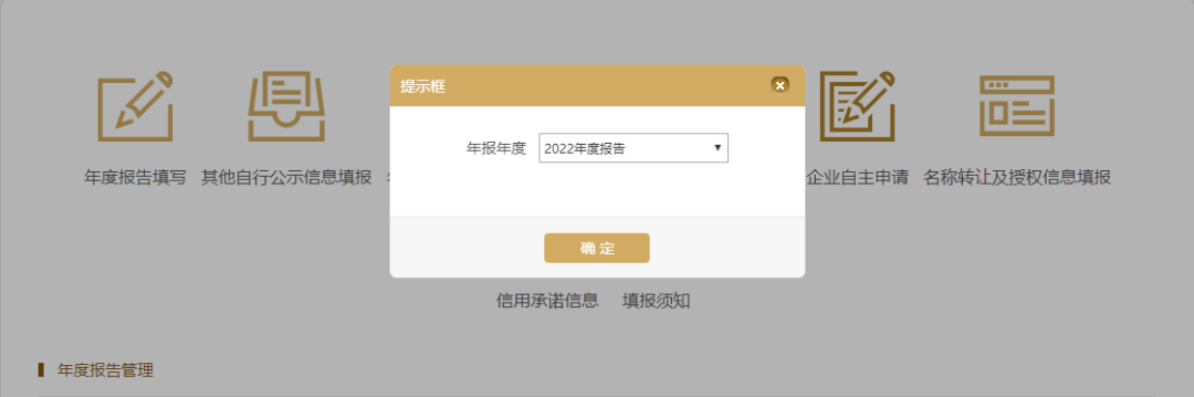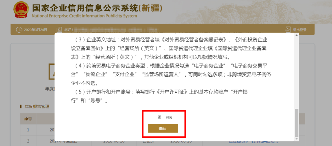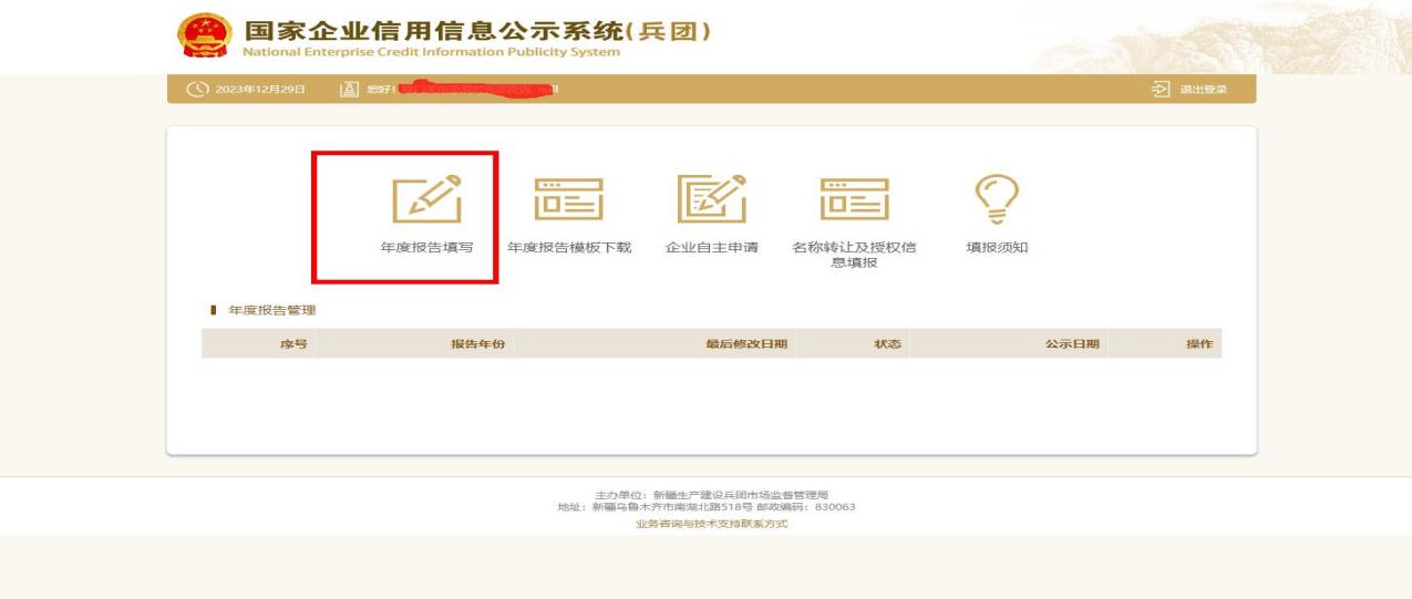 完成登录操作,进入“企业信息填报”主界面,点击“年度报告填写”,阅读“填报须知”,勾选“我已阅读以上填报须知”并点击“确认”。