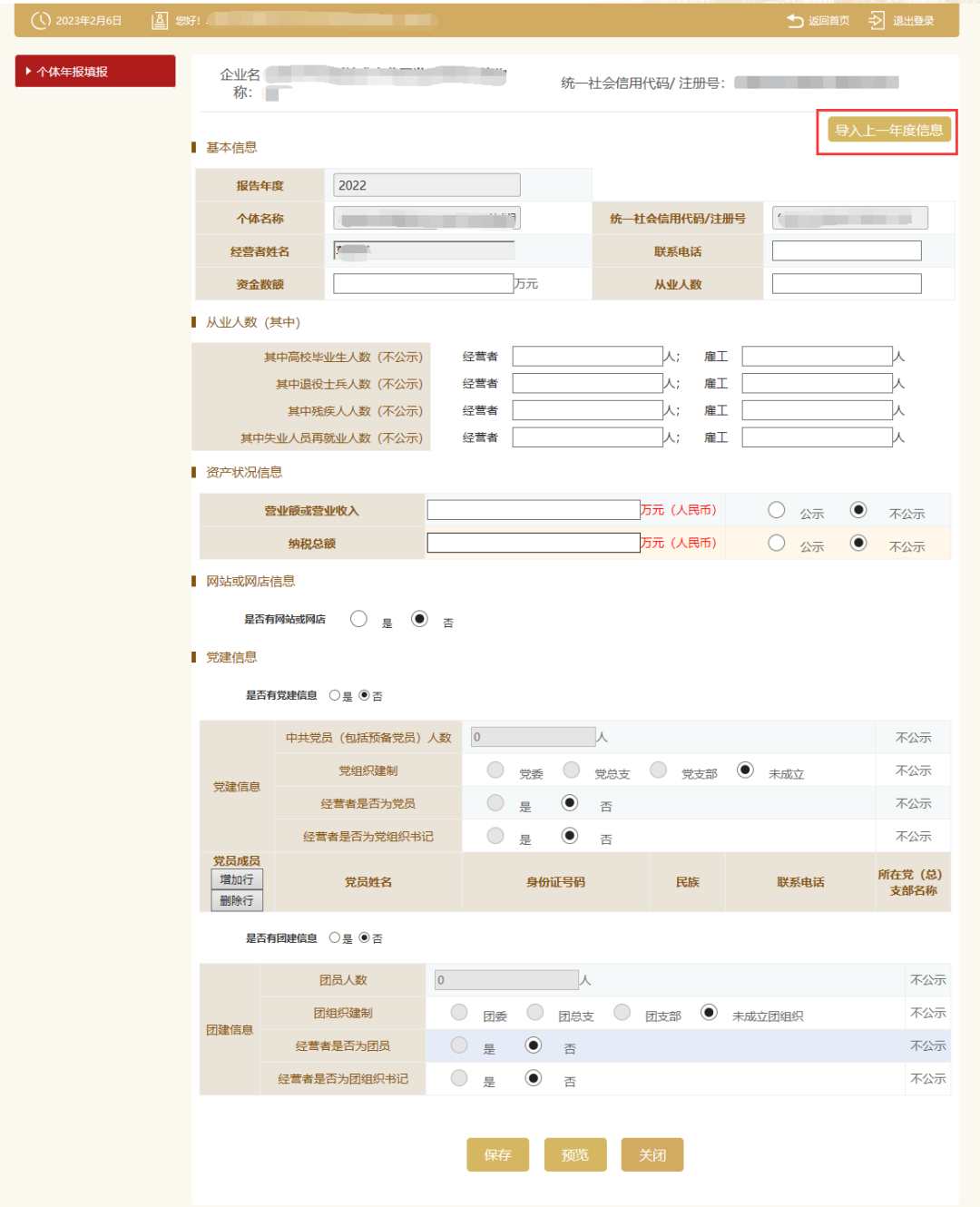 导入上一年度信息:点击“导入上一年度信息”按钮,上一年度年报信息即可自动带出,个体工商户自行核对信息,发生变化可进行修改,未发生变化直接点击保存提交并公示。