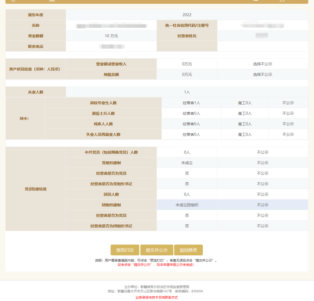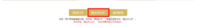 所有信息填写核对完成后,先点击“保存”,再点击“预览”,进入预览界面,可点击“预览打印”;审核无误后点击“提交并公示”。如未点击“提交并公示”,则本年度年度报告公示未完成。
