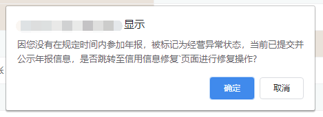 经营异常状态的个体工商户,自行网上补报年报后,系统自动关联提示进行信用信息修复操作。
