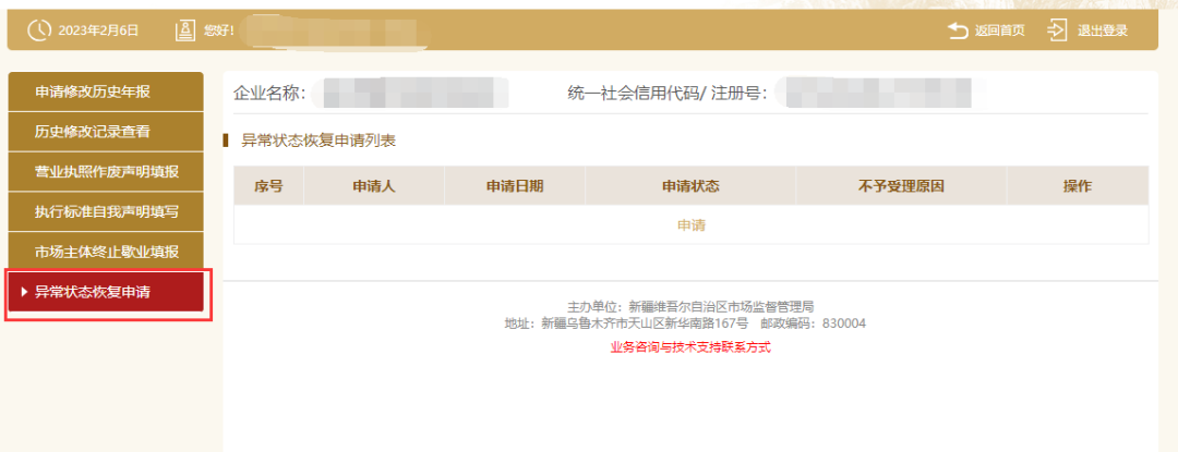 4.点击“确定”,跳转至“异常状态恢复申请”页面,个体工商户可自行申请恢复异常状态。