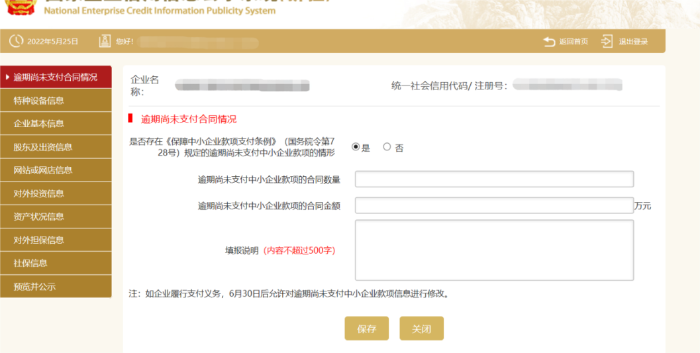 为贯彻落实《保障中小企业款项支付条例》(国务院令第728号),“大型企业应当将逾期尚未支付中小企业款项的合同数量、金额等信息纳入企业年度报告,通过企业信用信息公示系统向社会公示”。自2020年度年报开始,大型企业要将上述情况通过国家企业信用信息公示系统(兵团)填报并公示。
