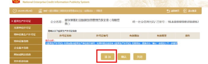 《疫苗生产许可证》的添加是由疫苗生产单位进行填写,如果年报企业没有《疫苗生产许可证》无需添加,直接点击“确认”按钮进入下一步填写。