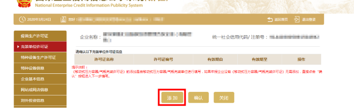 《移动式压力容器/气瓶充装许可证》的添加是由移动式压力容器/气瓶充装单位进行填写,如果年报企业没有《移动式压力容器/气瓶充装许可证》无需添加,直接点击“确认”按钮进入下一步填写。