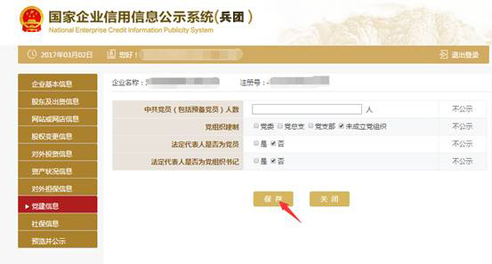 10.填写党建信息。党建信息为不公示信息,主要采集企业党组织的建立情况,但属于抽查范围,请注意如实填写。其中,中共党员(包括预备党员)人数,为截至年度报告年份12月31日的人数。