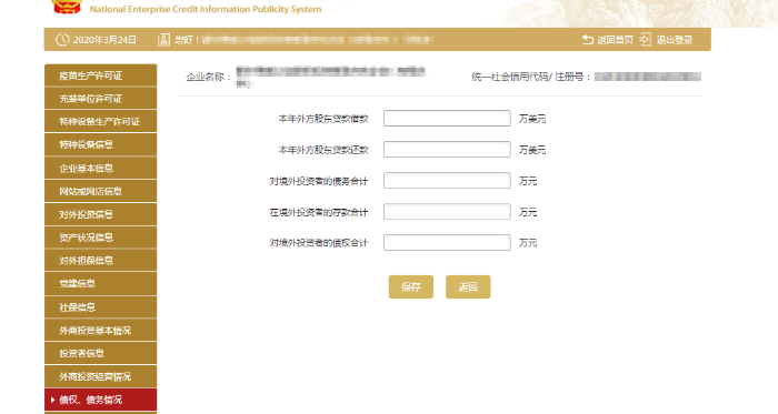 填写债权、债务情况,注意:本年外方股东贷款借款和本年外方股东贷款还款单位为美元。
