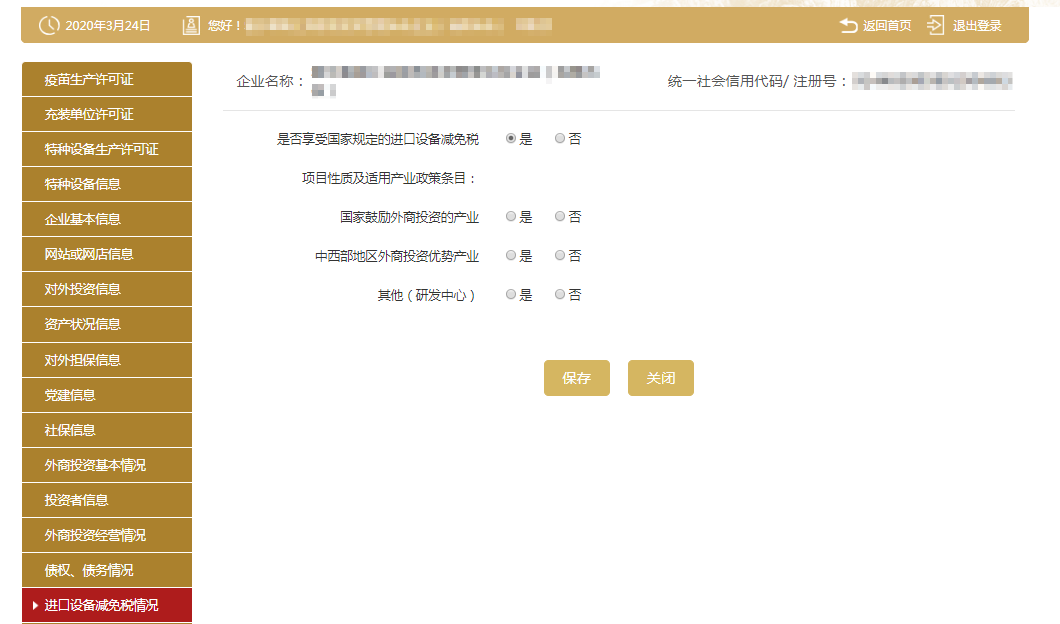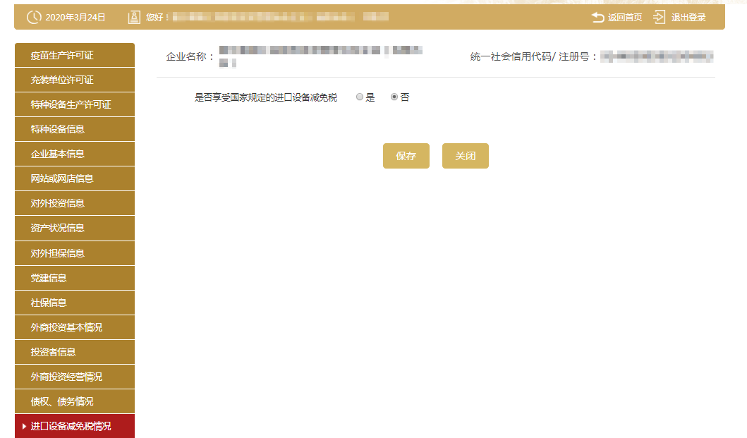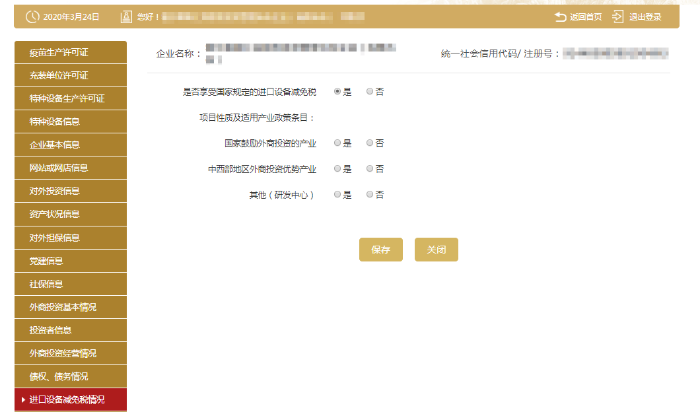 如果年报企业没有享受国家规定的进口设备减免税,则“是否享受国家规定的进口设备减免税”一项选择为“否”;反之,选择为“是”,再根据企业实际情况选择“项目性质及适用产业政策条目”选项。