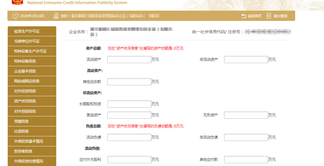 资产负债情况中须填写:资产总额、流动资产、非流动资产、负债总额、流动负债、所有者权益合计和归属于外方股东的权益,单位均为万元。