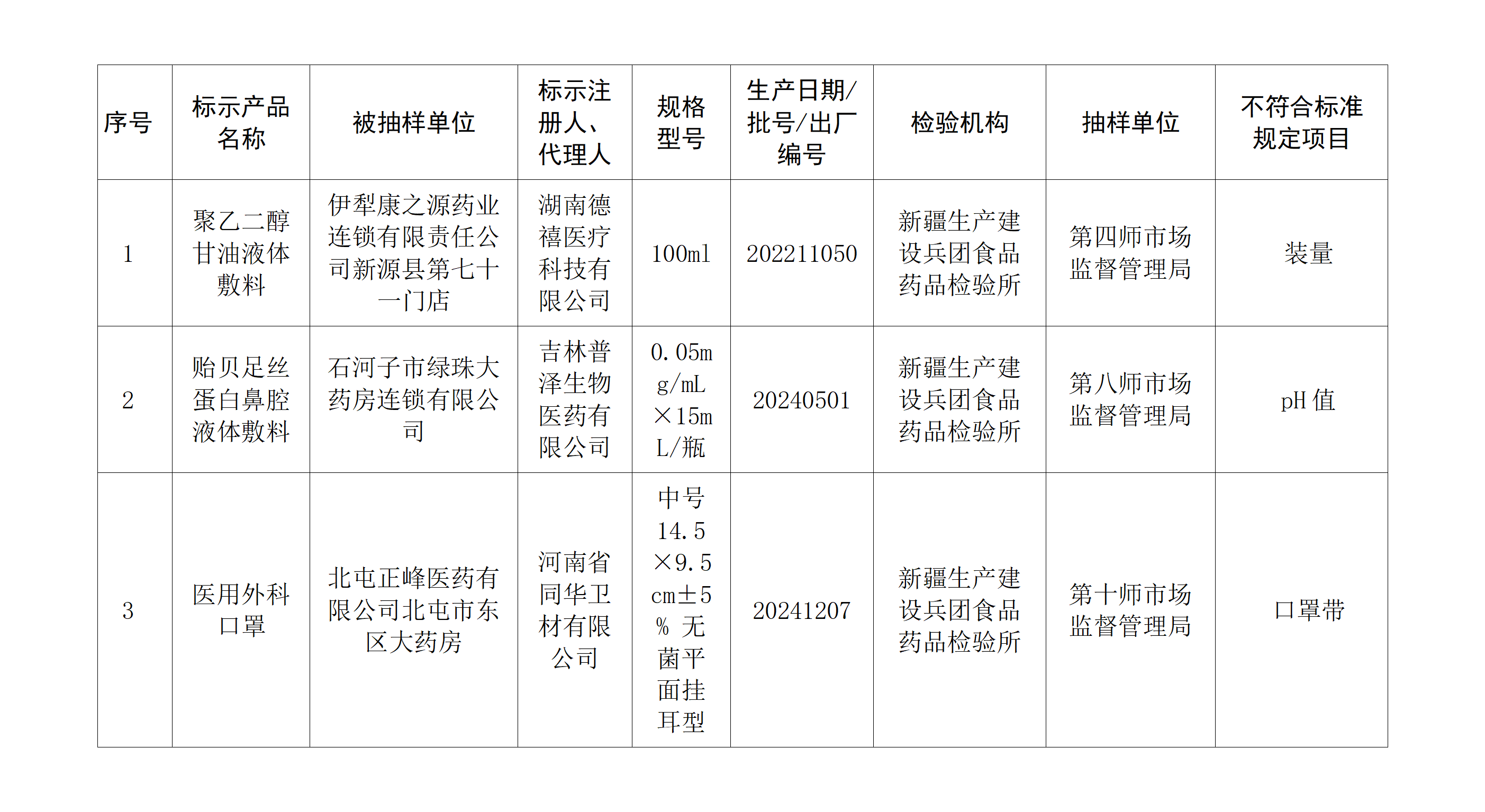 根据兵团2025年医疗器械质量监督抽检工作计划,兵团药监局组织对辖区医疗器械生产、经营企业和使用单位的医疗器械进行了监督抽检,现将3批次抽检结果不符合标准规定的医疗器械及有关情况予以公告(见下表)。对于公告中抽检结果不符合标准规定医疗器械涉及的相关单位,已依据有关法律法规采取风险控制措施,予以查处。